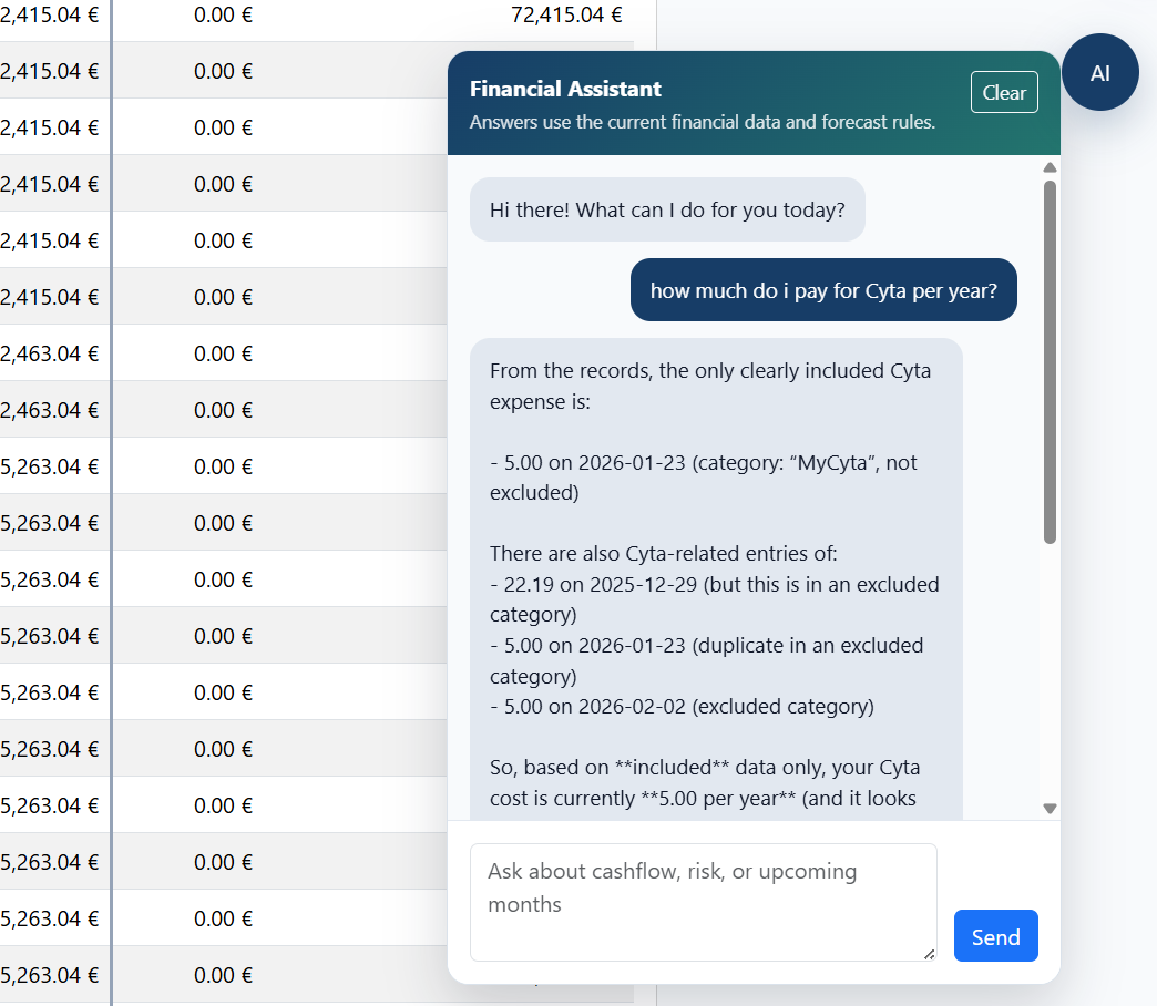 Designed and developed a Symfony-based cash projection system for tracking income, expenses, and short-term cash availability. The application converts spreadsheet-style financial management into a structured web platform with persistent storage, improved forecasting, and better day-to-day visibility. It also includes an integrated AI chat interface that reads stored records and provides detailed, context-aware answers to financial queries.